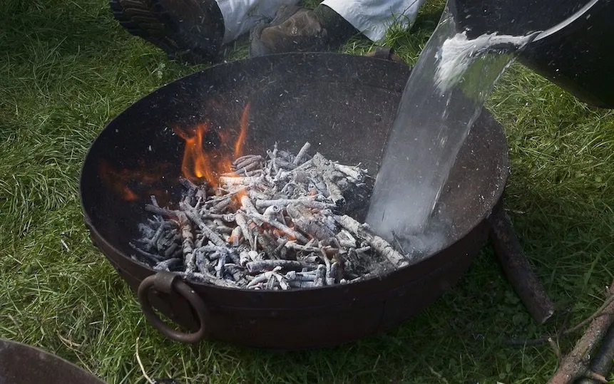 Be careful—steam and hot embers can cause burns. Stir gently to ensure everything cools evenly.