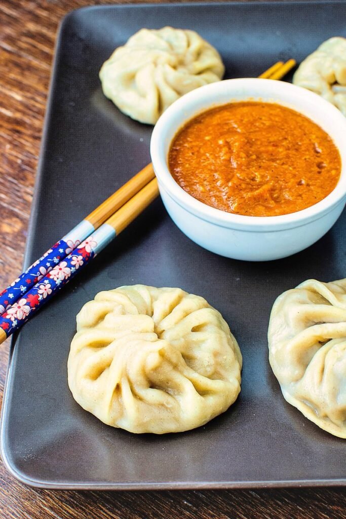 Your delicious Veg Momos with Spicy Chutney are now ready to serve!
