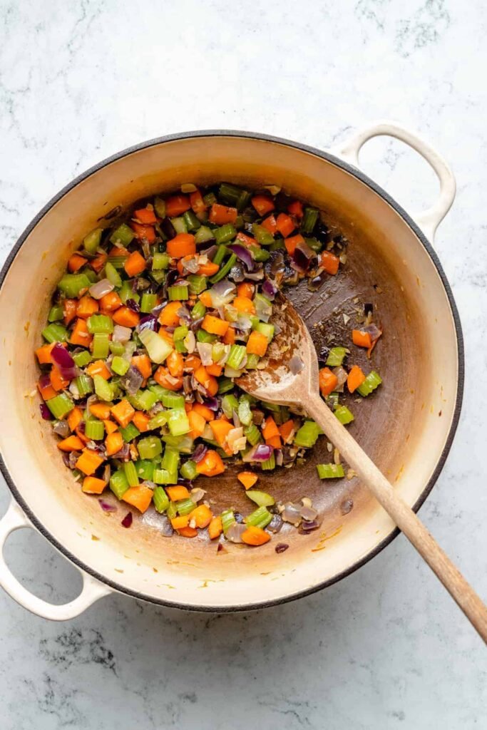 Cooking lentils with aromatics infuses the soup with flavor and helps achieve a rich base.