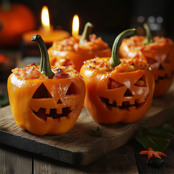 When it comes to Halloween recipes, presentation is everything—and this dish delivers big on spooky charm. The carved bell peppers look like miniature pumpkins glowing with personality, and the savory filling brings comfort food warmth to a chilly October evening.