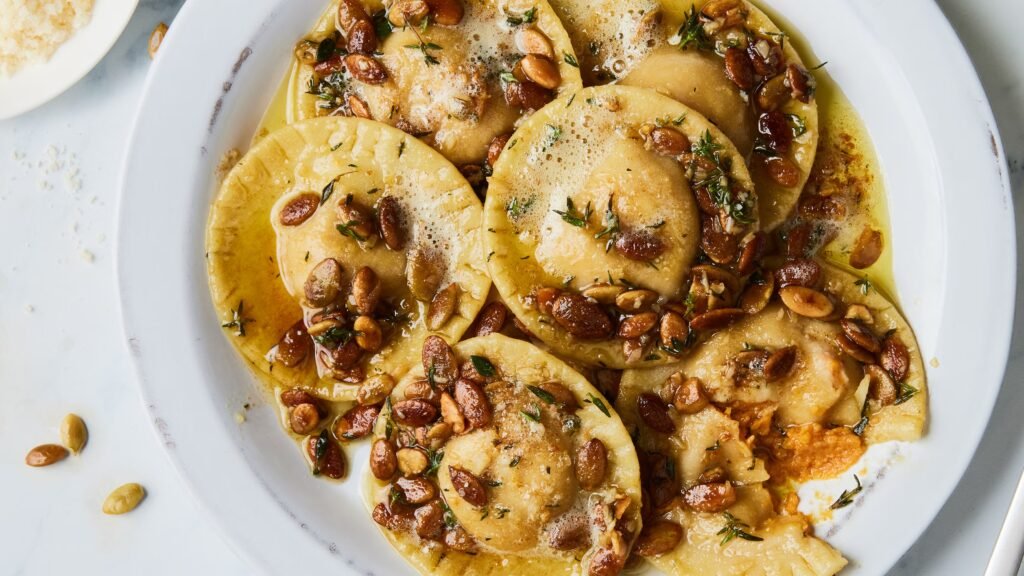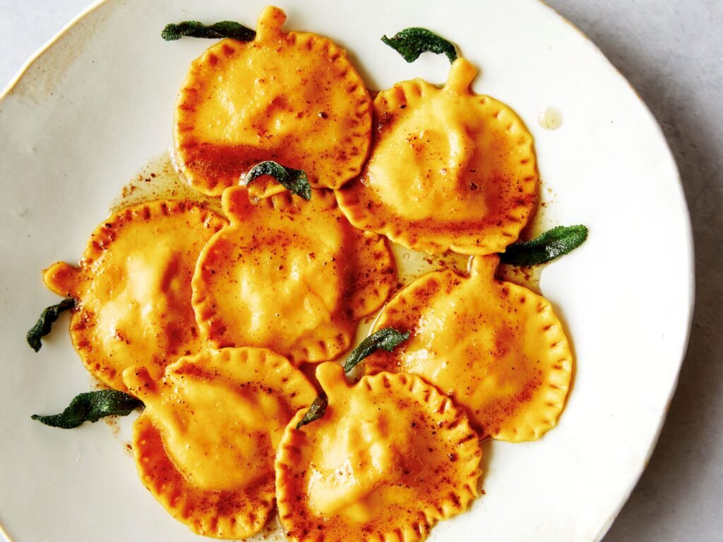• Pumpkin Plate Presentation: Serve the ravioli on a dark plate and garnish with roasted pumpkin seeds and sage leaves for a fall-inspired look.