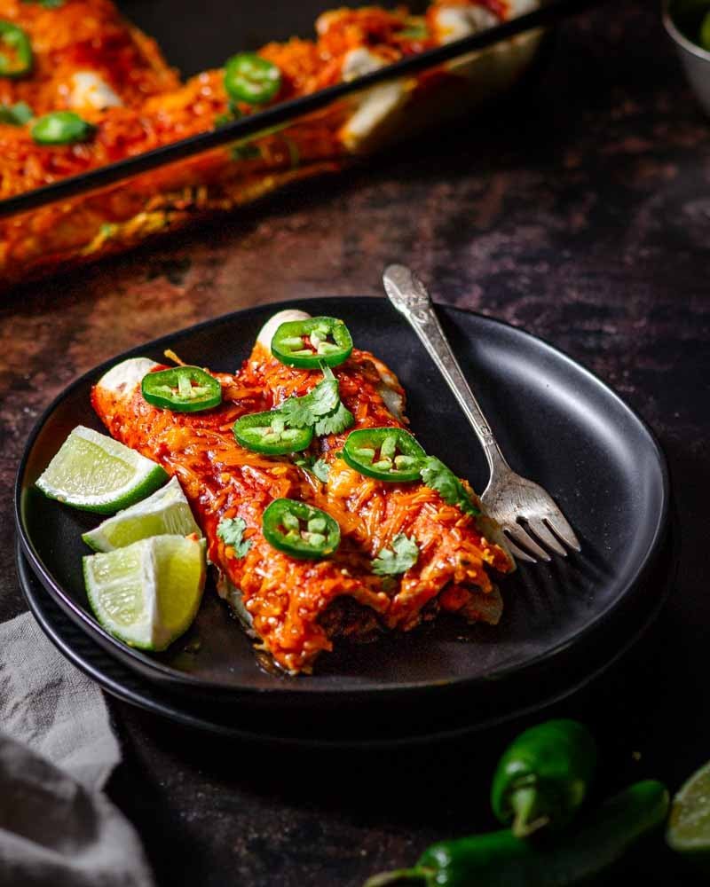 Cut one enchilada open on the plate and let the sauce drip dramatically for that “freshly bitten” vampire aesthetic.